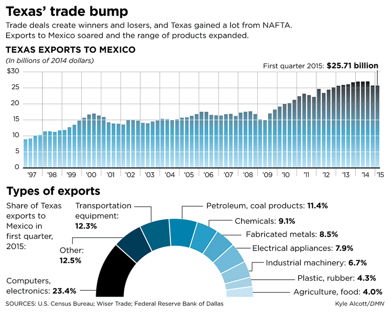 At the same time, Texas exports to Mexico have grown more diverse, led by computers, electronics manufacturing and transportation equipment.